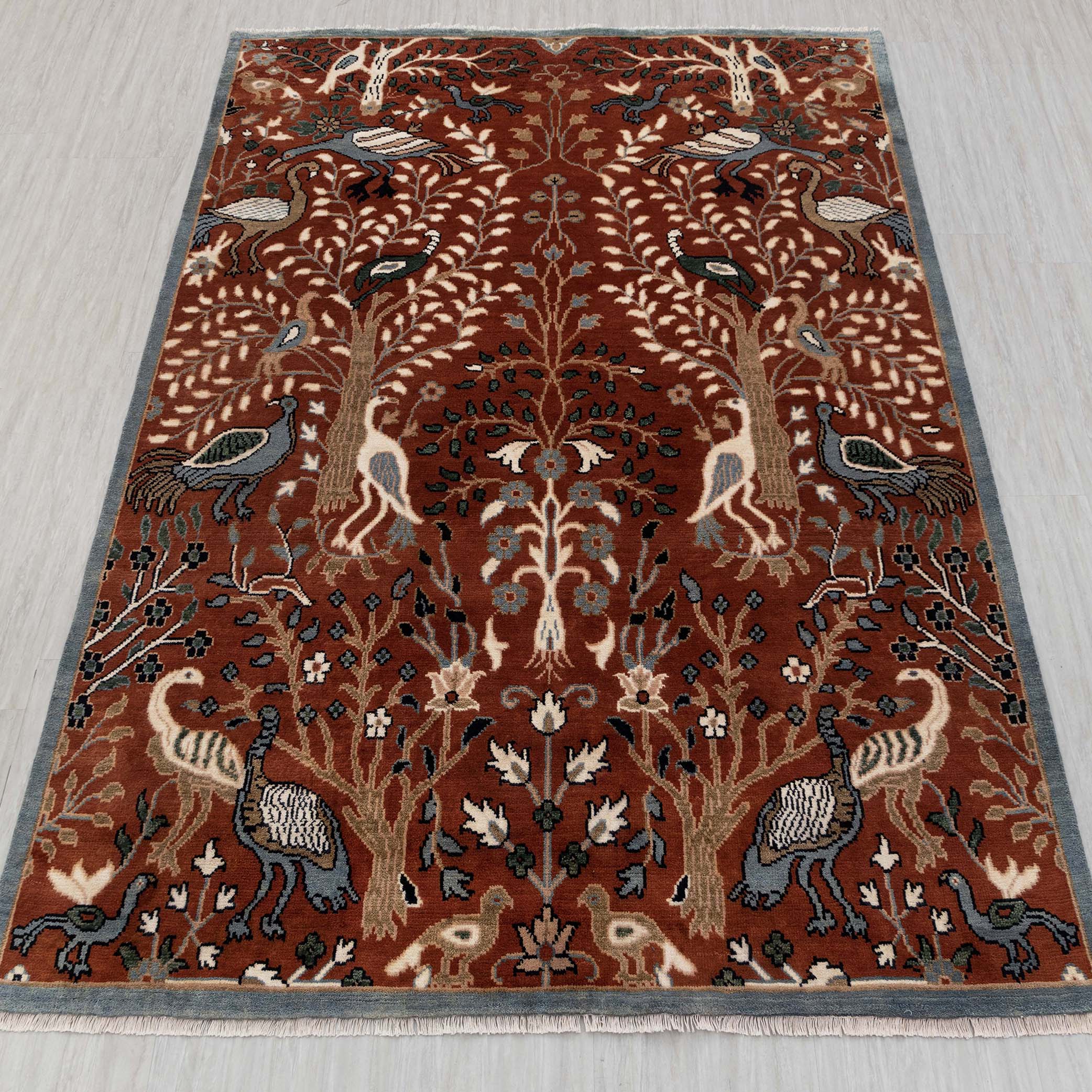 Heather - 8x10 Red Wool Birds & Trees Hand Knotted Garden View Rug